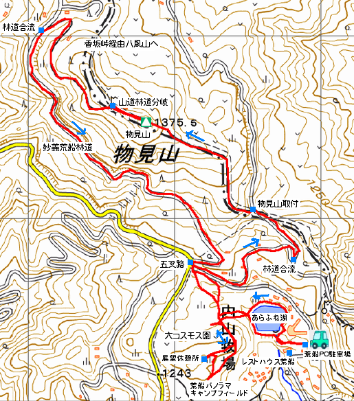 荒船PC駐車場 8:50 ... 9:20 大コスモス園(APC荒船パノラマキャンプフィールド)9:55 ... 10:10 五叉路 ... 林道 ... |
