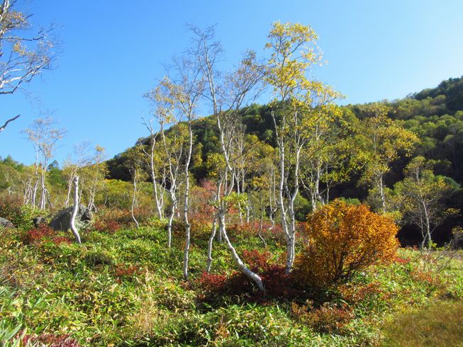 ▲ 白樺の黄色とツツジの紅 | |||||||||||||||