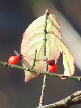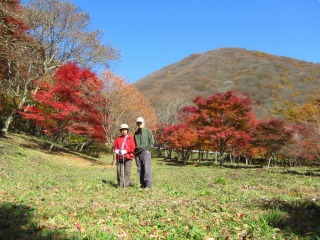 来た道を戻り、榛名温泉からは紅葉の綺麗な車道を歩いて帰る。 峠を下るとモミジエリアに出たので、最近マイブームのツーショット。 |