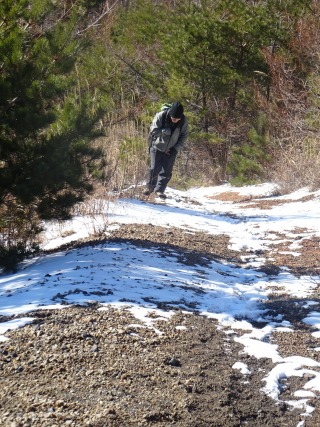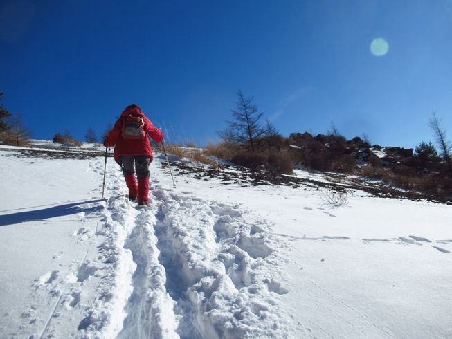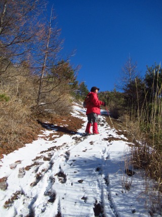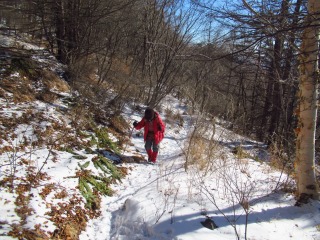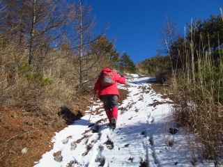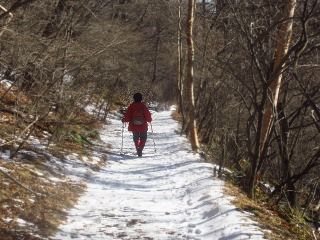 幅広な林道ちっくな登山道は、数cmの雪が踏まれていて歩きやすい。 木々に囲まれているので風はそよとも吹かず。 最近は空身のはらっぱも、きょうはミニザック姿です。 |