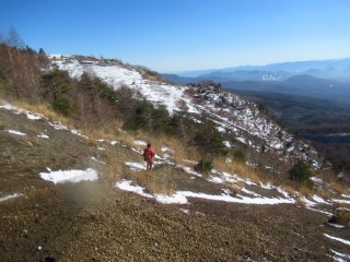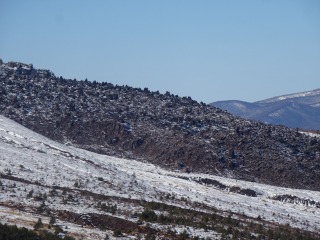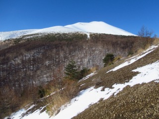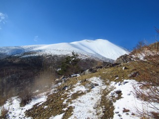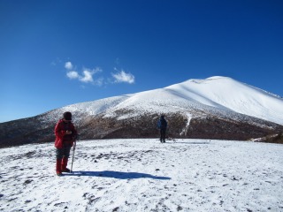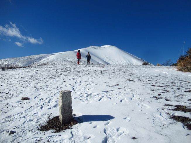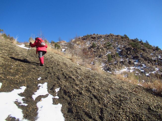 チョンボ道のメリットは、ショートカット&展望に優れていること。 ズルズル崩れて歩きにくい火山礫の斜面が、今はコチコチに凍っているので、歩きやすいからと油断していると滑ることがあるので要注意。 ![]() |