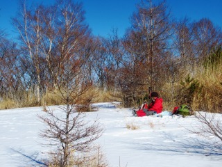 西峰に寄って帰ろう。 雪面にシートを敷いて、急ごしらえの浅間山かぶりつき席 寒くならないうちに下山しよう。 |