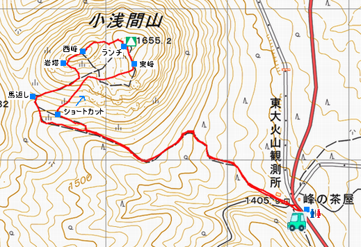 登山口PS 9:35 ... 10:25 ショートカット ... 10:55 小浅間山東峰 11:10 ... 11:20 浅間かぶりつき 【L】 11:40 ... 11:50 西峰 12:00 ... |
