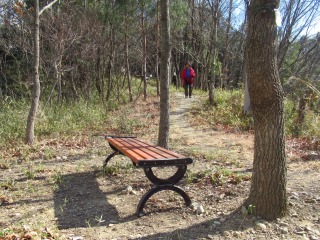 尾根通しの道は、木漏れ日があって明るく歩き易い道だった。 沢に下りる折り返しポイントの先に、新しそうなベンチがひとつ。 小野子山と子持山の間に白い山が見えるが、上越国境稜線ではない。 |