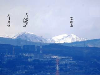 | ▲ 送電鉄塔がビュ~ビュ~ | ▲ 小野子山と子持山の間は谷川岳天神尾根方面 谷川岳や白毛門、朝日は雪雲の中 |