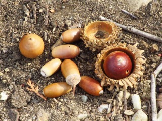 | ▲ クヌギの丸いドングリと細身のドングリ | |||