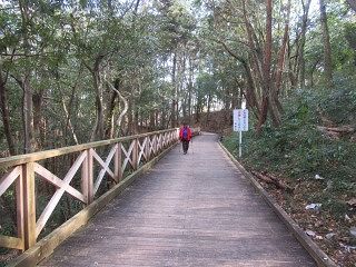 野鳥の森から染料植物園まで歩く元気がないので、車移動 駐車場には2台しかいなかった。 染料植物園手前から、ひびき橋への高架木道に入る。 |