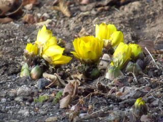 | ▲ 染色工芸館の花壇で咲き始めた福寿草 | ▲ 染料植物園内の通路 | ||