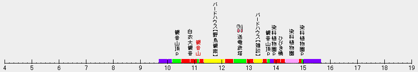 | 12:25 送電鉄塔 【L】 12:55 ... 13:10 バードハウス 13:30 ... 13:40 観音山頂駐車場 13:45 = 13:55 染料植物園駐車場 | |||