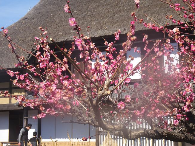 紅梅、白梅、蝋梅が庭を彩り、足元には節分草と福寿草。