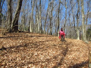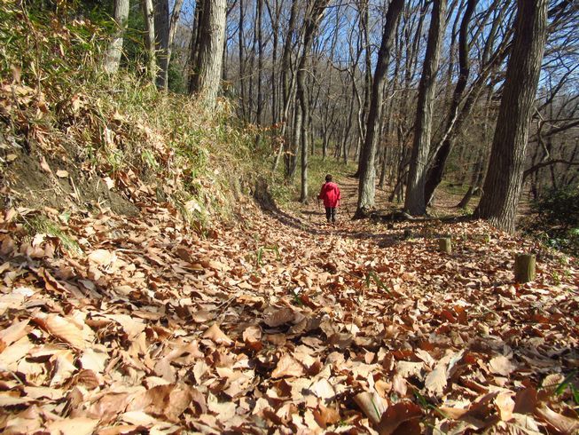 ふじ山を捲いて南外周道を歩き、一段高い捲き道に入ったら落ち葉の堆積が半端なく、ガサガサと気持ち良い歩き。